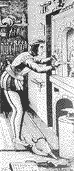 | Our tour begins from the environment that constitutes the lab, which has a very high vault so to allow a constant air volume despite the presence of flames to weld or the fireplace for the fusion. The workbench is arranged in a way to get the maximum luminosity from a big window so to avoid that the artisan casts his shadow on the table. The very solid workbench is placed on a wood floor, excellent to recuperate fragments and gold dust. The most important tools are hung all over the walls. The window, open on top as an air hole but closed at the bottom to avoid ill-intentioned visits, has hanging a balancing scale (basaculla, in archaic Valenzan) fit to weight those things that Cellini used to call "grosseria" or better to say those objects of certain dimensions like, for example, silver chalices and candelabrums. We can notice also a huge chain with a medallion; objects that - as it shown in most of that period prints - are often wore by the Renaissance Lords. The scale and the big chain with every probability made "store window", or to show to the passing persons the kind of work they were doing over there. The lab entrance was probably on the side of who observes the print, and opened directly on the street. Let's go on the goldsmith workbench. To the left we notice the traditional stool, called in Valezan "tabuart" (a curious Gallicism) which differs by the actual only because it has three legs instead of four. From the workbench sticks out a kind of parallelepiped flattened on the tip: no goldsmith could get confused: it's the "stocco" ("stock" in Valenzan). Probably on it there is some virgin wax useful for the hacksaw. It differs in the shape only because it has kind of channel, fit to hold semi-wrought, just before it unites with the table. This simple, elementary and indispensable tool is a little the symbol of the goldsmith job. As matter of fact the goldsmith will abandon it only when is reduce by the usage to a stump; but he won't throw it, because even in this residue there is trapped a small quantity of gold that can be recuperated in the ashes. The "stocco" serves as a support place for the job to do and constitutes a kind of "friction" for the file hits that biting on the wood before the metal became softer and moderate. For this reason the goldsmith "stocco" has soft round surfaces, especially on tip, differently of that of the stone setter. The "stocco" of the stone setter has in fact in the center the hole where to put the spindle with the jewel to mount and it characterize also by having on one side cavities more or less pronounced, due to the habit to try with a little hit if the engraver is sufficiently sharp, before it bites the metal |