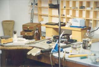 | At the left of the big window we notice again two big pitch spindles, two hand drills, the same as the one on the workbench and still the same to the ones in Valenza until a few years ago, before the arrival of the power drill. But some old stone setters won't despise still today, for particular jobs, the hand drill more sensible to the hand pressure and with which it can measure the mill rotation with the maximum precision, without considering additionally that...it works all the time even without electricity! Once again we notice engravers, clamps and two pliers, and on the right the series of shears to cut the plate, of different sizes. The apprentice, that holds the empty spot at the table, is standing up and he's fusing, managing on the fire the melting pot. At his feet there is the blower, "bufat" in Valenzan, that is used to poke the fire, blowing air. In the corner fixed on a log, there is a small anvil, like today's, naturally. Certainly, now in the factories there are the power machines, there is the pressure die-casting, which is a technique already known from before the Renaissance - and for sure already in use by the Maya's - and that is an evolution of the lost wax casting, technology that is lost in the dawn of times. The mills are made of special steels, like the engravers. But before the gas was brought in the labs, the gold was welded with the "lurnèra" a small alcohol stove, which flame was directed by a blowpipe on the part to weld, exactly as four thousand years ago by the Ancient Egyptians. Furthermore, before the electrical illumination the lamp on the workbench was made of a sphere full of water (the globe), which projected the oil lamp light on the "stocco". The ancient goldsmiths knew for sure the cuttlebone fusion technique, like it was used by our goldsmiths of about thirty years ago and as it results from an inventory of a 400's Florentine lab, the one of Bartholomew Di Pierre kept by the State Archive of Florence. Certainly the gas first, and the electric power then, have turned upside down the production times, as the same as the pressure die-casting technique. All of this allowed Valenza, like everywhere else, the diffusion and development of the goldsmith's art making it, if we want, a little less "specialistic", as well as - let's admit it - a little more convenient. But gas and electrical power just substituted themselves to what already existed, they didn't add anything because the goldsmith evolves, but in essence it remains unchanged in time |