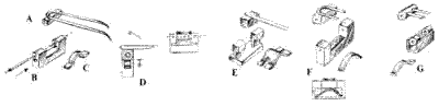 In some cases for small brooches double needles without the final closing are used. The needle is fixed on a clasp which has a square form on the outside, the female part has a spring in the centre on which the same needle will be hinged (dis. C) the spring is white gold and operates against the edge of the clasp of the needle and it will keep it open or closed (dis. D). There are also other types of springs (dis. E-G).