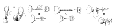 A good thing to do when you want to fix an earring to the lobe of an ear, is to proportion the form of the "dip" with the "dip" of the object both for aesthetics reasons and for a good balance. If this isn't correct and the meccanic force isn't right it will make the earring hang or turn round. The most simple way to wear an earring with the ears pierced is the one called (dis. A) that consists in a curved wire that passes through the lobe and joins the base |