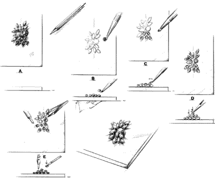 For those jewels that have only stones engraved on them, once their design is disposed (dis. 4 A) little thin sticks of clay are used, and little small balls are made out of them. These have the same size of a grain of rice and proportioned to the dimension of the stones. With the help of a stick the little ball is positioned in the middle of every stone (dis. 4 C). Once the small balls are placed they will have to be a bit smaller in width than the stone. Other small balls, with the same size as before, are placed one upon the other squashing them slightly so they can stick on properly. When the right height is reached, the stones are placed (dis. 4 E) and only when the movement and the vertical and horizontal distances between the stones (dis. 4 F) is right and there isn't too much air between a stone and another, these can be fixed on. This is necessary to avoid having uncovered studs appearing once the object is finished and that would deprive the jewel of