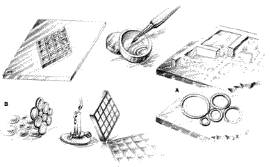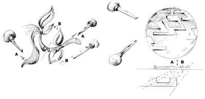 The technique of the "day or cathedral" enamel is called "plique-à-jour" enamelling. Here the enamel hasn't got the metallic base and is contained only by metal borders (dis. A). The transparence of the enamel allows the light to exalt the colours. In the enamelling and cooking phases, the object is laid on a metal surface made of platinum, that doesn't stick to the enamel.