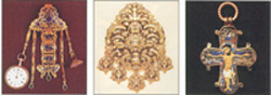 Filigreed enamel. It's a variety of enameling on partition used in the Renaissance. It became a technique used mainly in Venice, it distinguishes from the enameling on partition because the threads are in filigreed and these are the ones to retain the enamel. Here it cannot be used the finishing in the oven because the border of the filigreed don't perfectly coincide with the enamel layer, so there is a chance to flatten out.