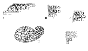 The embedding on a plate is used for both a single stone and for more stones together according to the design of the object and to the effect that one wants to get. The plate is prepared with one or more holes (dis. A) and these holes must have such a countersink that the "culas" of the stone will lean on it in a regular way; the stones' belt will have to be slightly shorter than the plan of the surface (dis. B). At this point, who embeds, will lift with the burin some metal points (3 o 4) around the stone according to the design and to the size of the stone (dis. C). When this is done he will take the